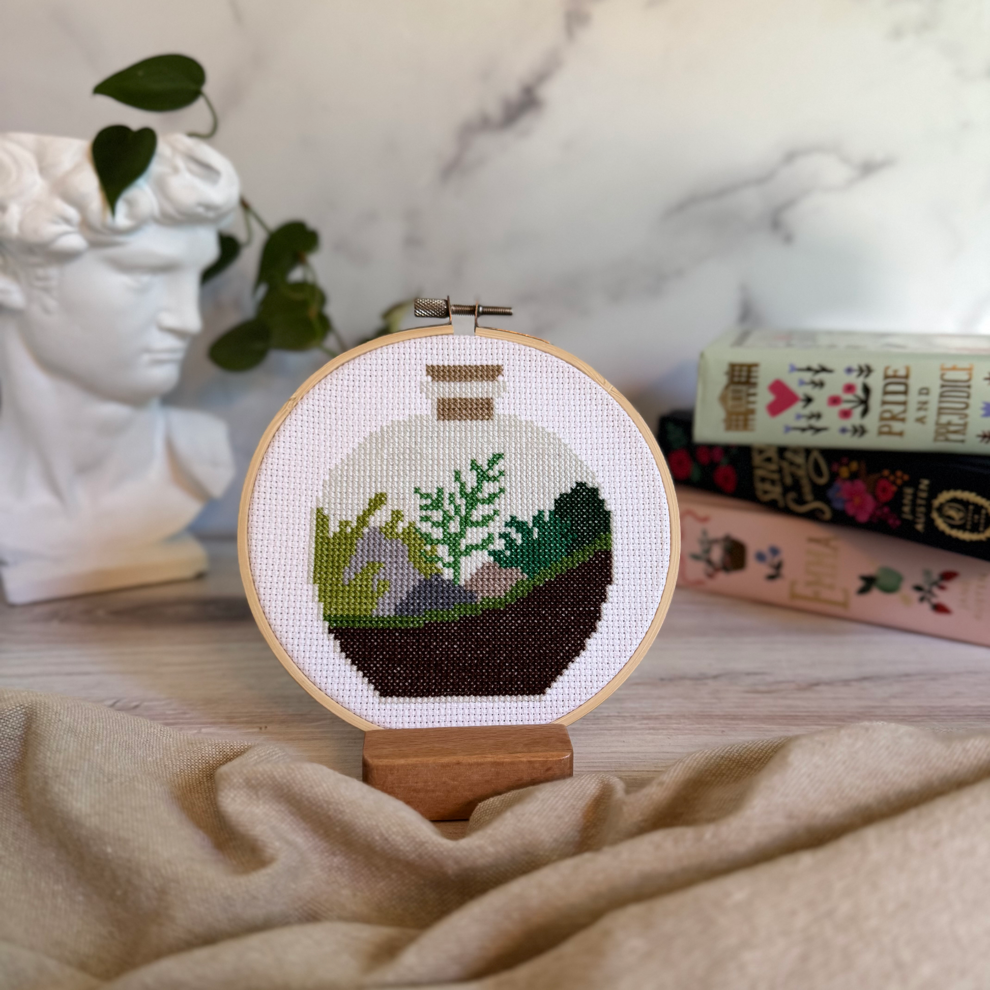 Tiny Terrarium is the perfect plant for those not graced with a green-thumb. Get all the plant vibes with none of the maintenance! This particular terrarium is designed after a real one I acquired on a trip to Asheville, NC several years ago. It sadly didn’t make it, but it lives on in stitch-form.